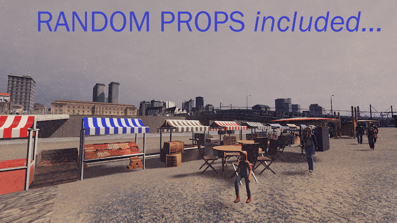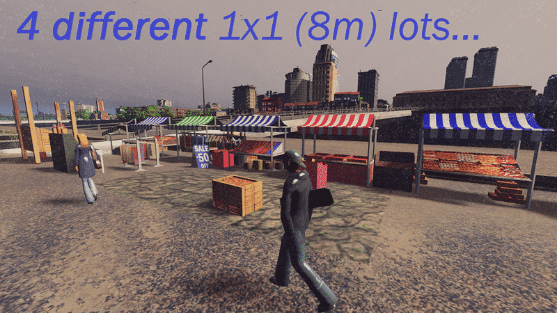 This download is a SET OF 4 ploppable market stalls. All four assets are included in this single download, as well as all the various props. On that note, I’ve used Boformer’s ‘prop probability’ mod to make sure that every time you plop these market stalls, they will come with a unique combination of realistic props. With just these four ploppable assets, you can make a bustling market-place…