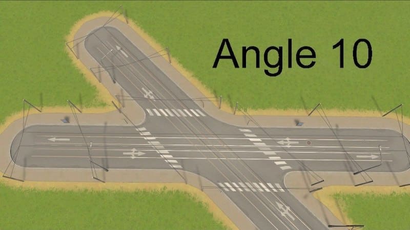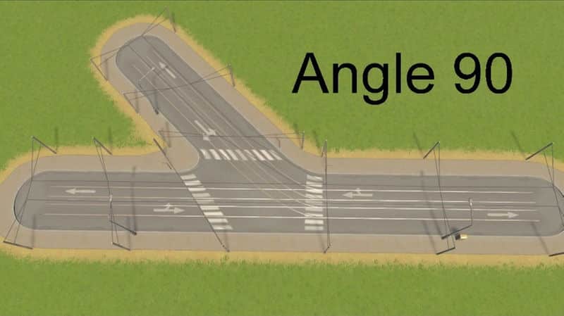 Setting 90 degrees replicates monorail track placement, while a smaller value (like 10) allows for an elegant X intersection.