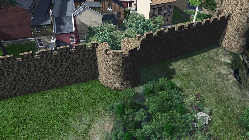 - Walls and gates are statless and terrain-conforming. Towers increase land value because of tourism.