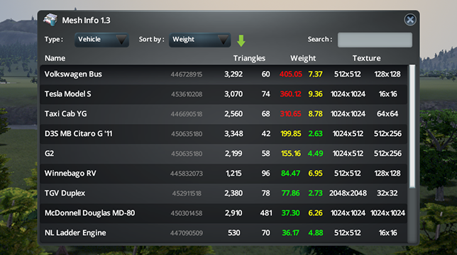 At majority of default assets (see super secret key combination) have a weight below 100 and very rarely above 200. For LODs it is about 5 and 10. Those are the reference values I took for the coloring.
