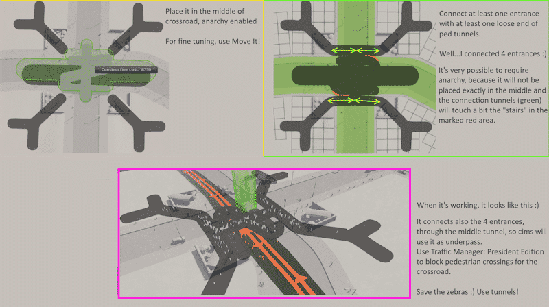 - designed specially for being used under a 90 degrees crossroad, to fit beween 4 MetroPed Entrance Diagonal. Plop it and then fine tune the position with Move It!, to have it as close as possible to the center of crossroad.
