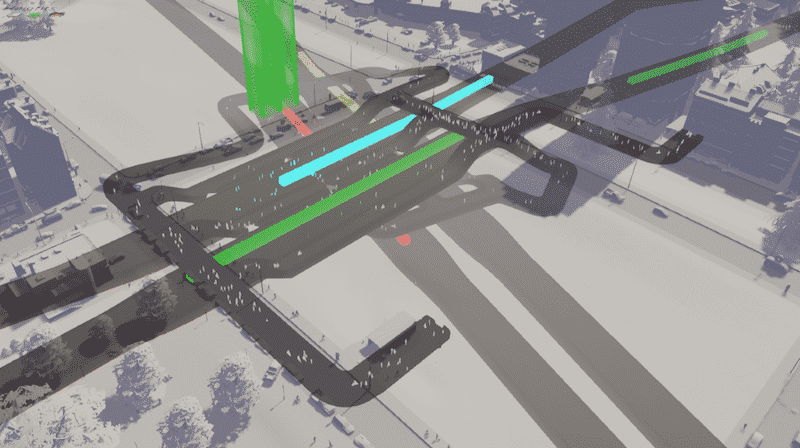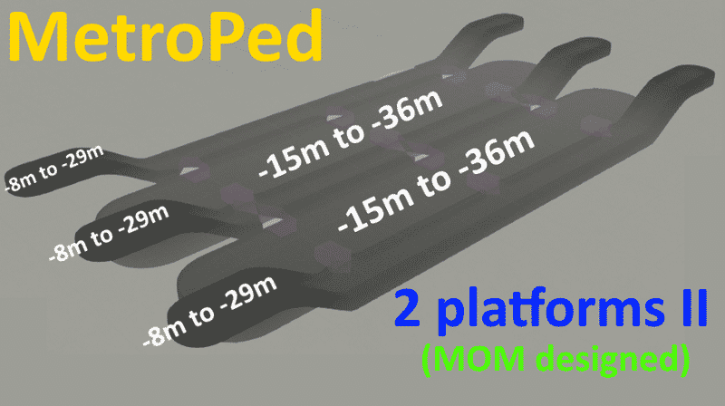 - create metro hubs using several stations at different depths and angles, connected with ped tunnels. Minimum recommended step between 2 stations is 12 m. See background images, with 2 stations hub: upper station (144m length, -15 m depth, 0 degrees), lower station (144 m length, -27m depth, 285 degrees)