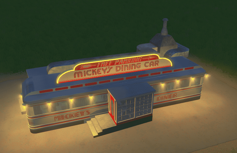 Mickey’s Diner, one of the very few preserved classic Art Deco dining carriages, pretty well known in america. now you get the chance to build it in your town ! your citizens will love to start their day here.