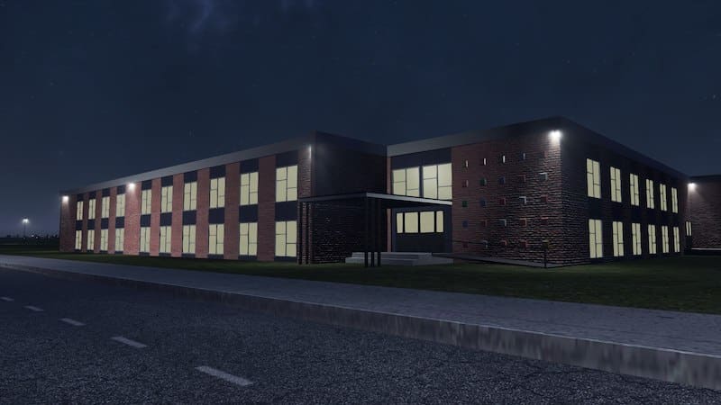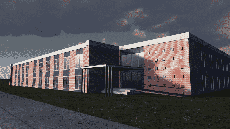 Not much to say. This is a pretty common style of elementary school in my region. Many were built in the early 70s and were built sturdy, all brick on the outside all cinder block on the inside. I’m quite happy with how the textures turned out on this one, I gotta say. It’s loosely based on Prince Street School[www.google.ca], which is in Charlottetown, P.E.I., Canada.