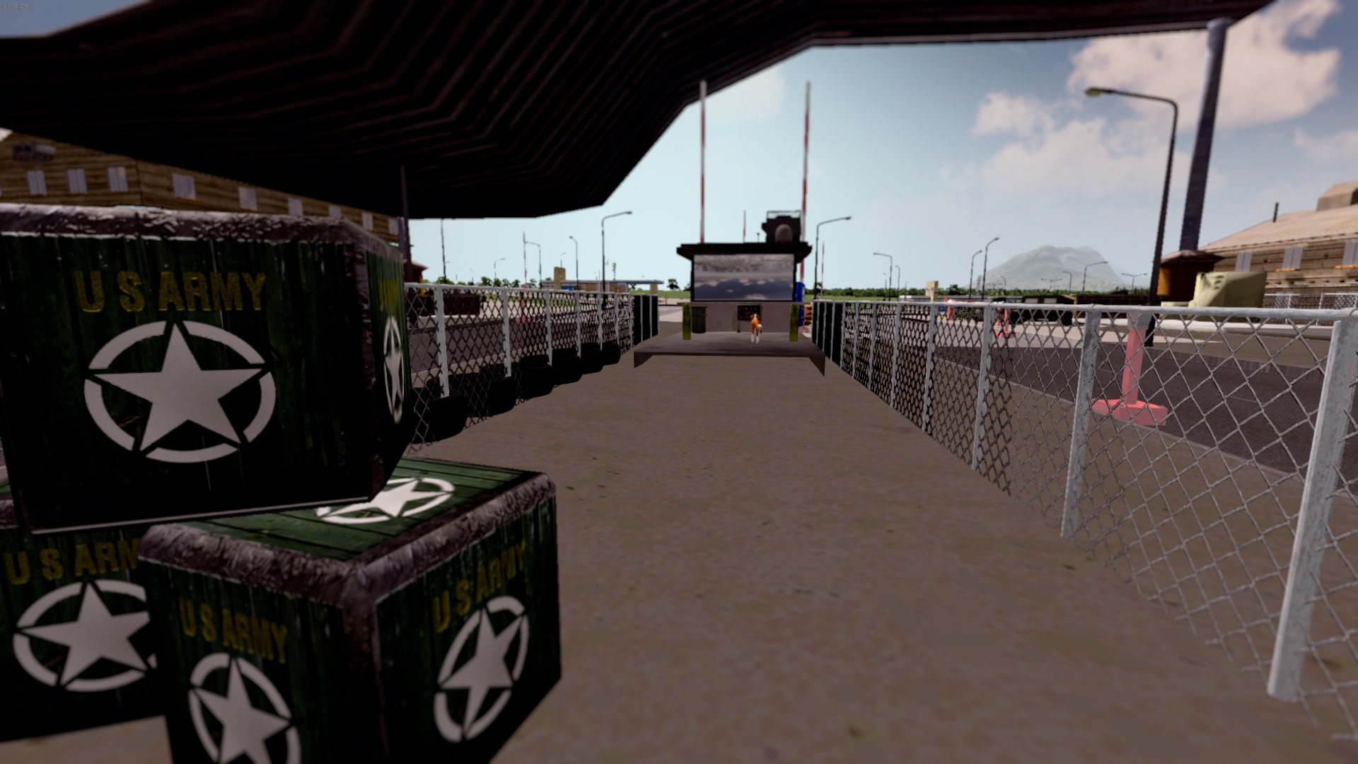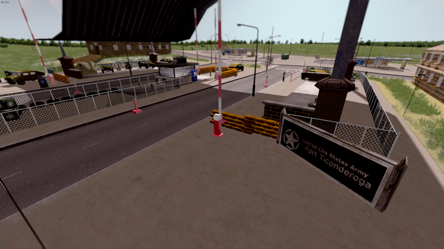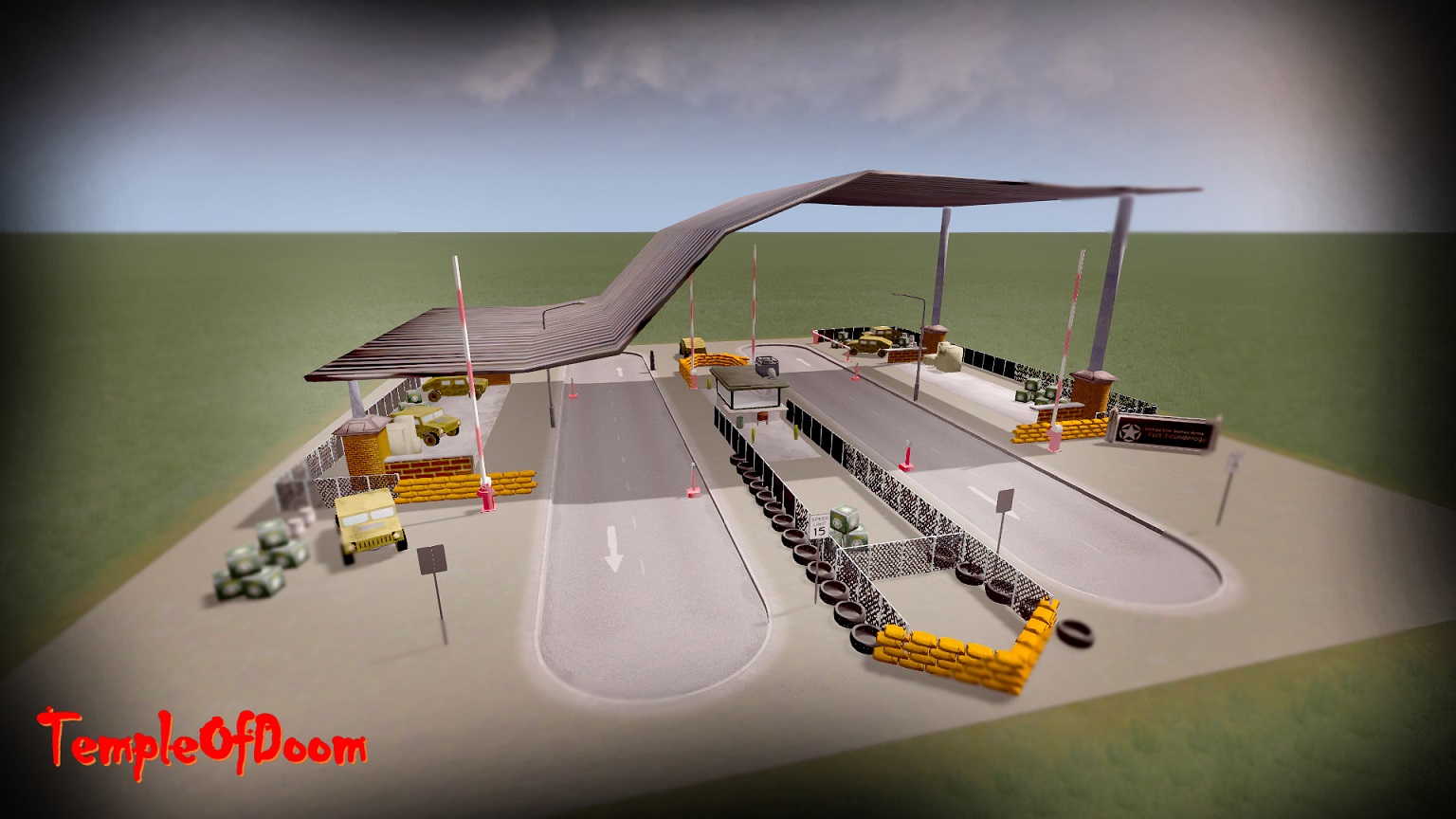 Military Base Main Gate – 9×9 plot with 2 roads pre-installed (2-ways). Guard shack in the middle with a couple of military base style signs you would see on real bases.