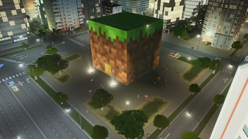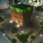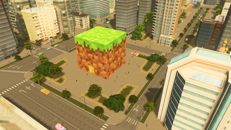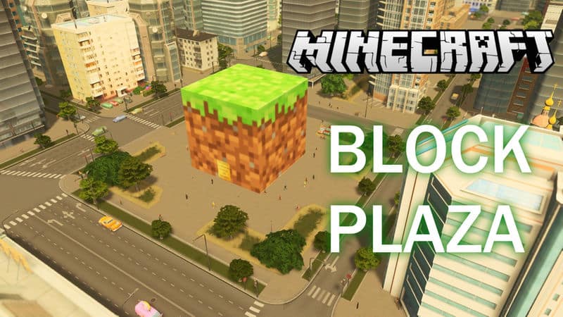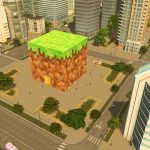 This plaza decorates your city with a giant Minecraft-grass-block!