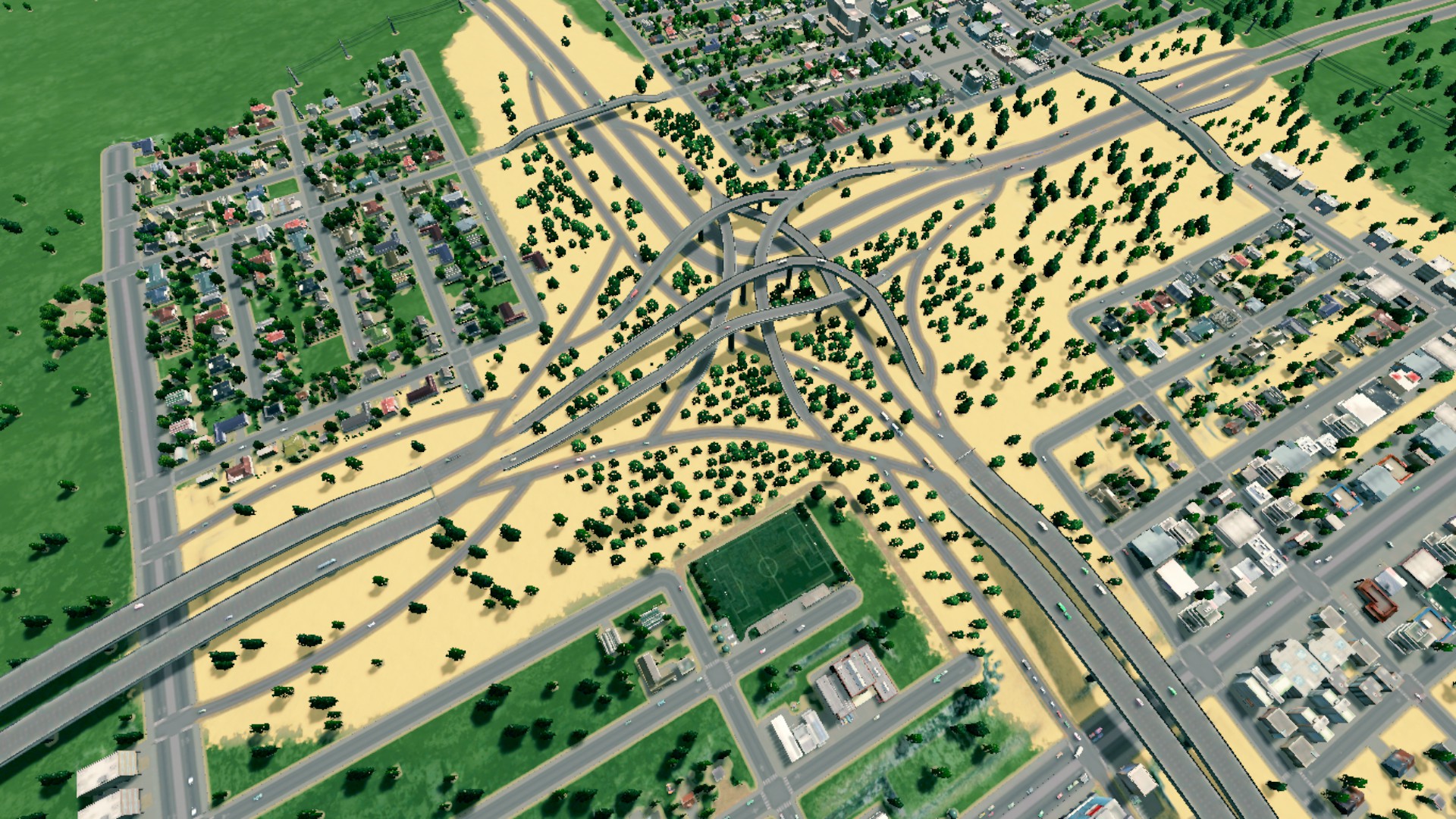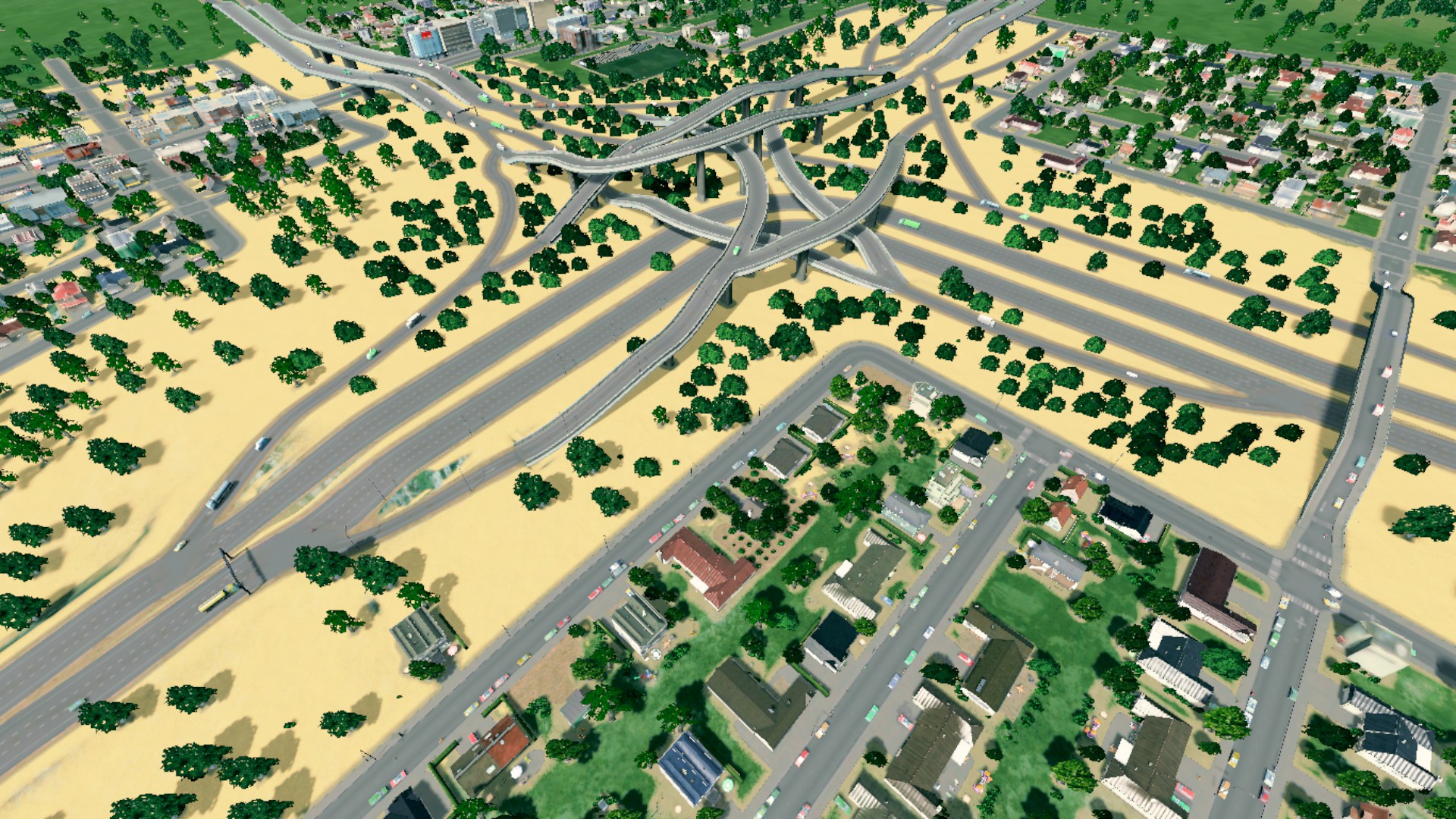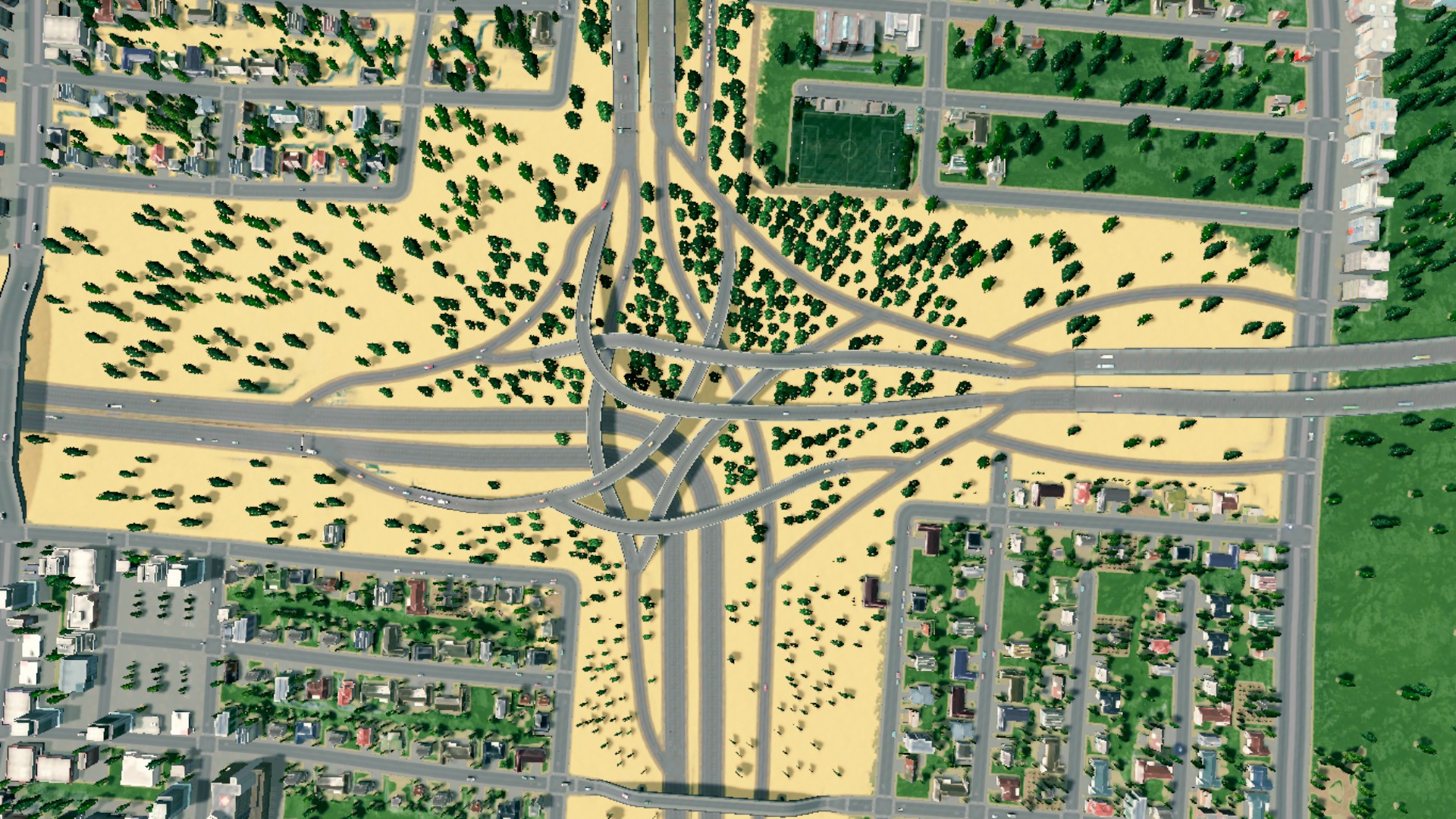 The Mini-Stack interchange in Phoenix, Arizona. This is where I10 meets highway 202 and highway 51. The stack is unique where the main highway is actually connected to the left, where other connections are made using ramps. The FOV lanes aren’t included. The interchange looks really smooth from above when used in a suburbian setting, like in the pictures.