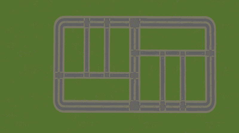 A medium grid to start a neighborhood, commercial area, or industrial district. This grid has no four-way intersections. To connect to another grid, just remove the medium road along one side and line the new one up with it.