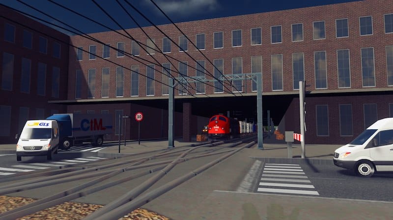 • Outgoing trains always spawn on the right, incoming arrive at the left (for right hand drive), causing them to cross if they leave out the gront of the building.