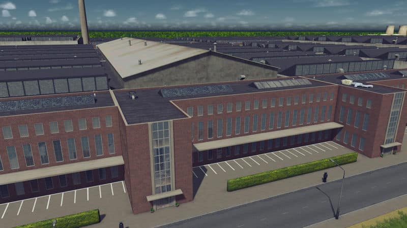 Factory floor with offices in front – this version has a large white gable roof. Works both on it’s own or together with the rest of the complex. Without the RICO mod this is just a park that doesn’t do anything. Atm it wants ALOT of highly educated workers – I will tweek this when possible through the RICO mod.