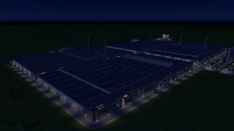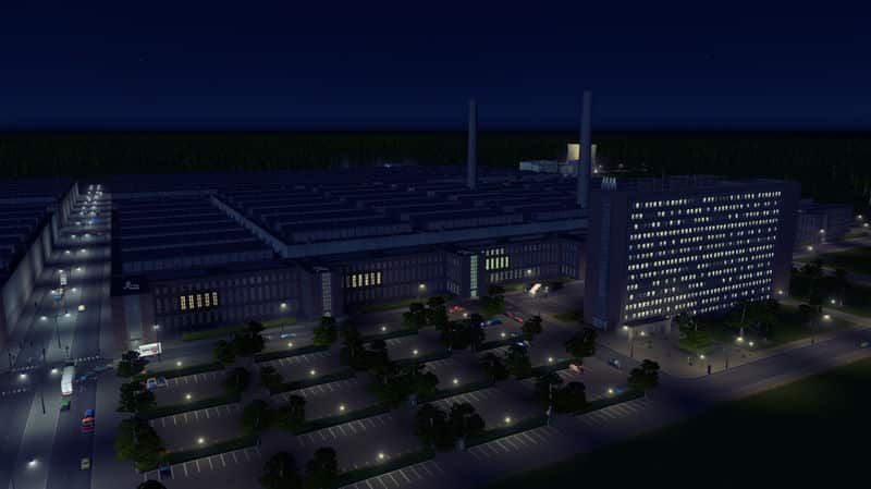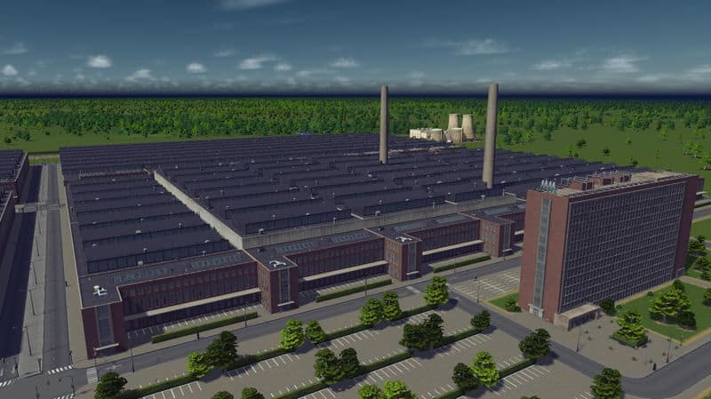 Factory floor with offices in front – this version has a large white gable roof. Works both on it’s own or together with the rest of the complex. Without the RICO mod this is just a park that doesn’t do anything. Atm it wants ALOT of highly educated workers – I will tweek this when possible through the RICO mod.