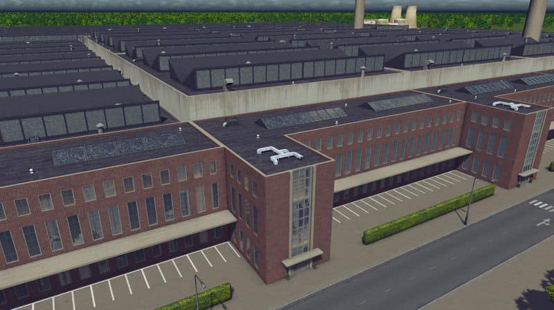 Factory floor with offices in front – this version has an extra high roof. Works both on it’s own or together with the rest of the complex. Without the RICO mod this is just a park that doesn’t do anything. Atm it wants ALOT of highly educated workers – I will tweek this when possible through the RICO mod.