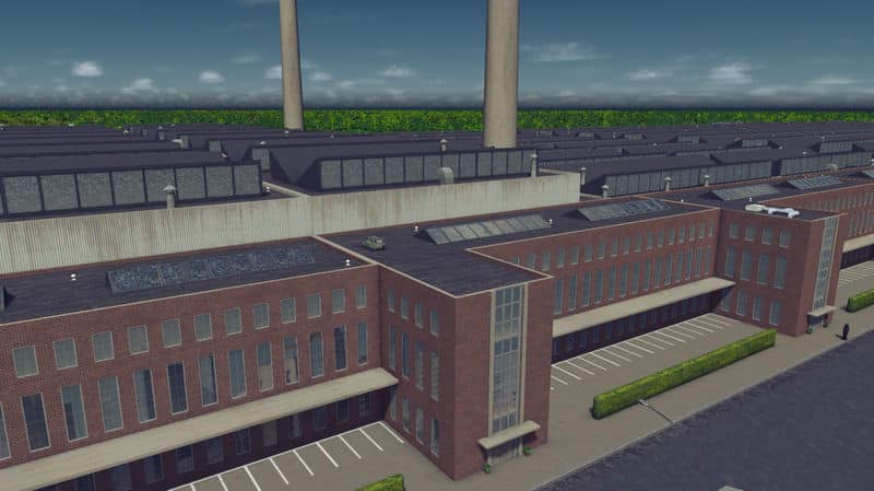 Factory floor with offices in front – this version has an extra high portion of the roof and a large smokestack. Works both on it’s own or together with the rest of the complex. Without the RICO mod this is just a park that doesn’t do anything. Atm it wants ALOT of highly educated workers – I will tweek this when possible through the RICO mod.