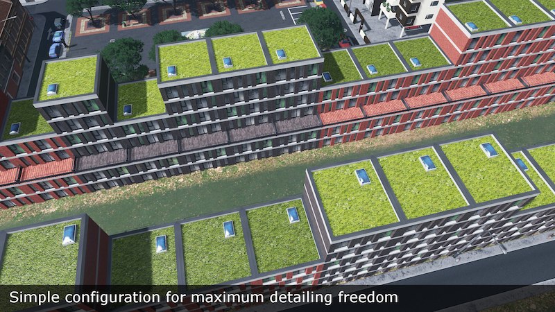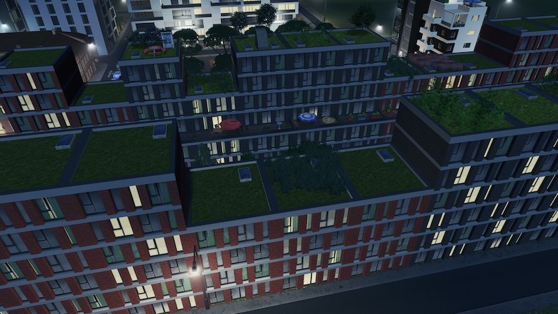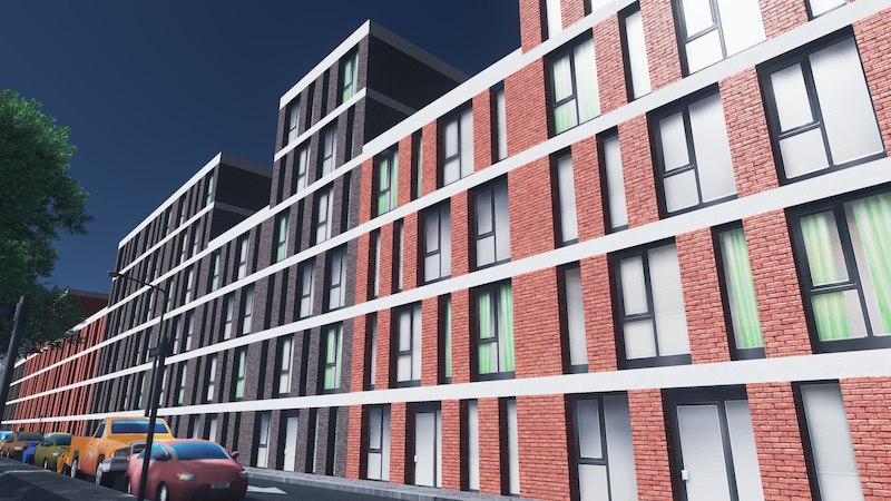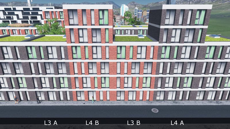 This is a pack containing 4 high-density residential growables: A 4-storey level 3 and a 6-storey level 4, both in red and black bricks.