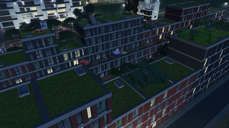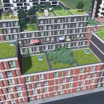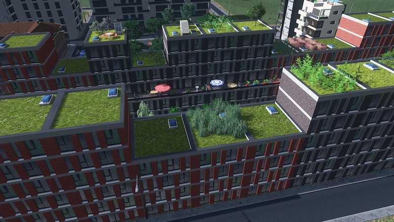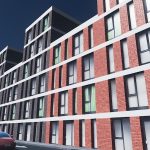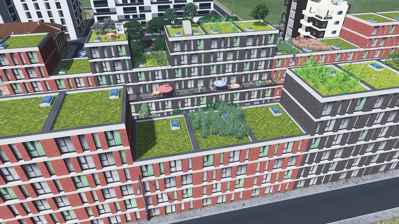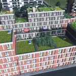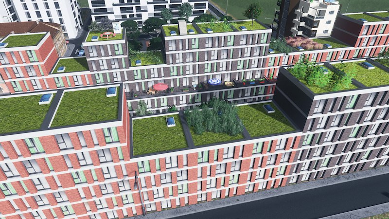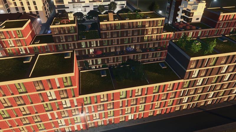 Modern wall-to-wall red and black brick apartments with a green roof.