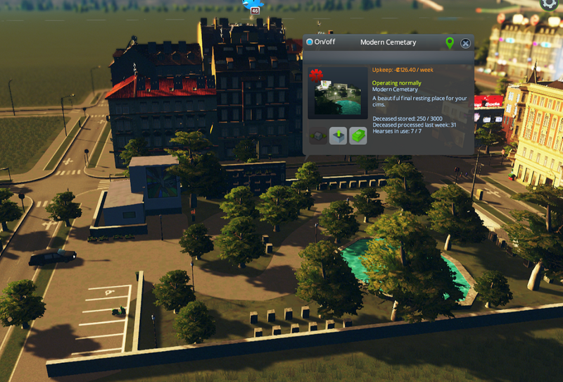 Modern Cemetary is a beautiful final resting place for your citizens. There is a small chapel / church, a special stone wall for urns, some grave stones and a pond. It acts as a cemetary and has the same stats as the “vanilla” cemetary.