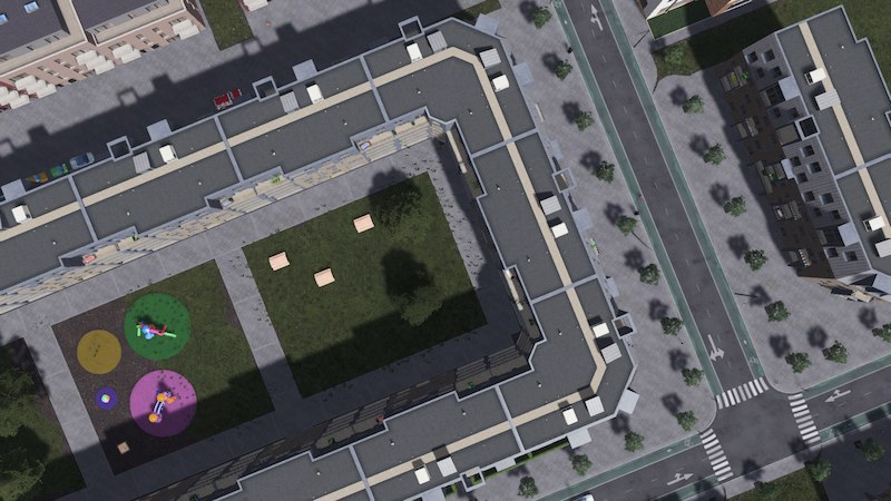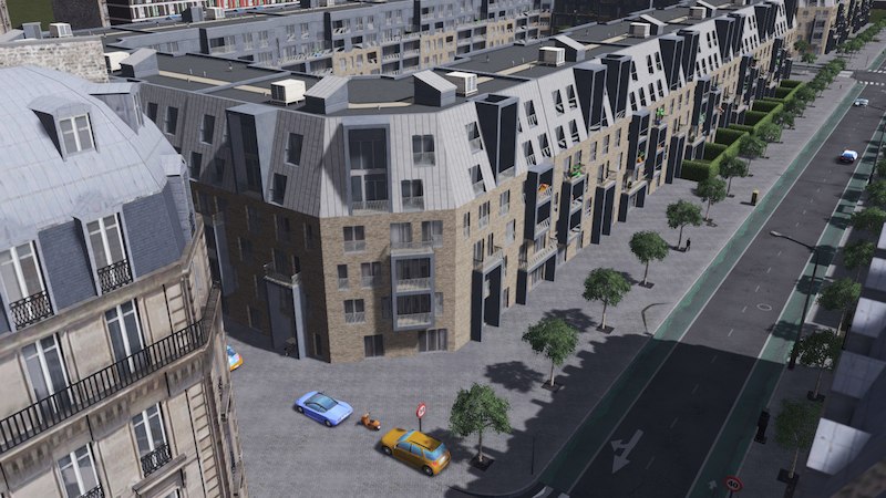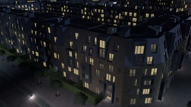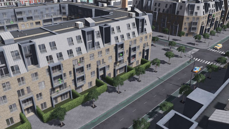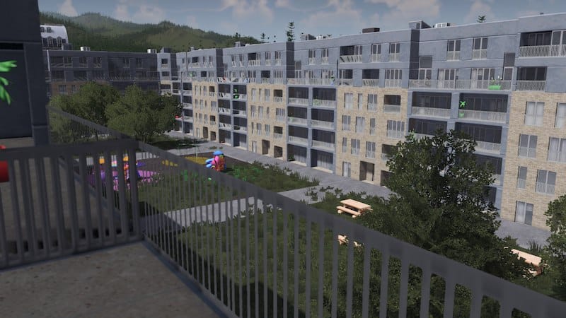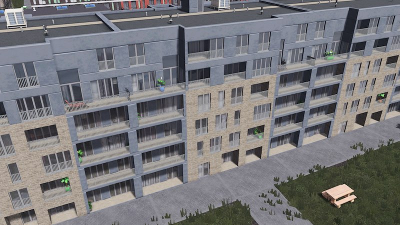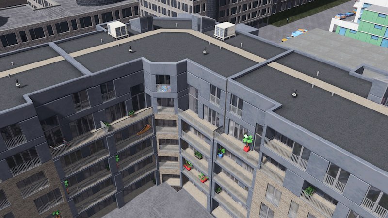 These assets are decorated with props only on the roof and balconies. Everything else has been added in-game to create these screenshots.