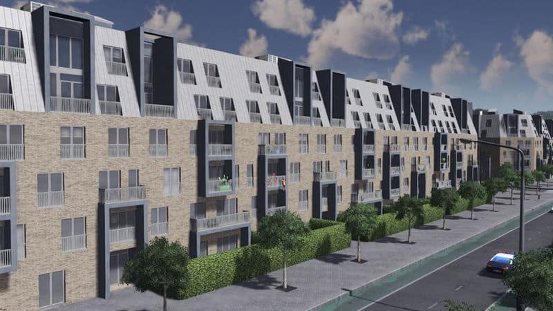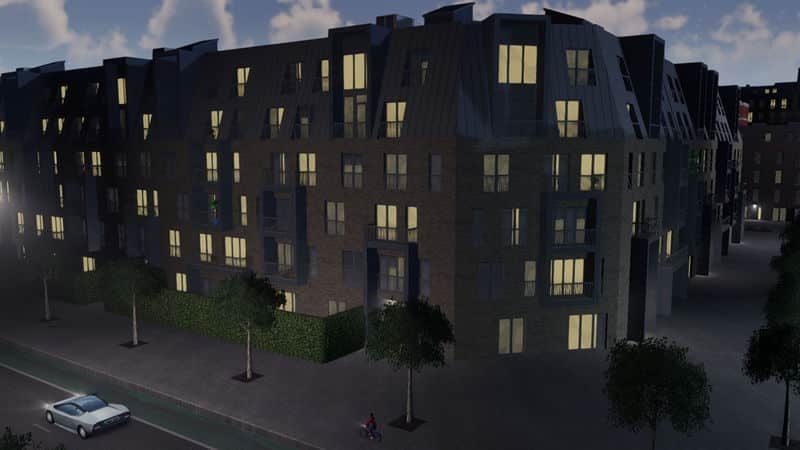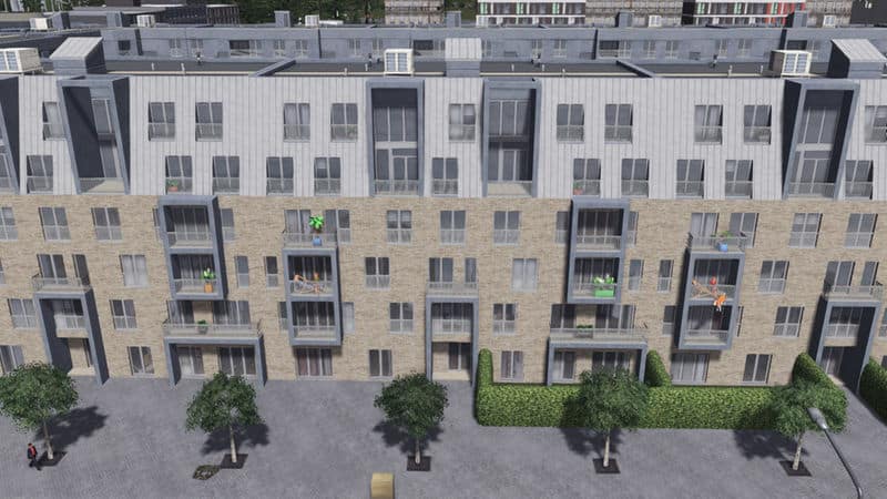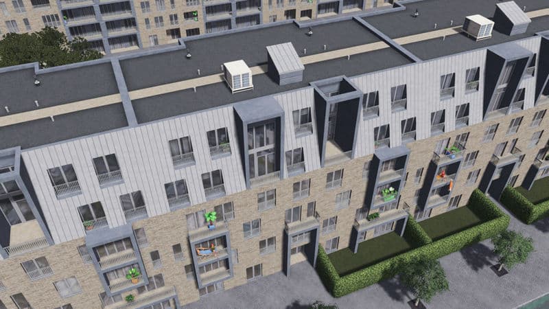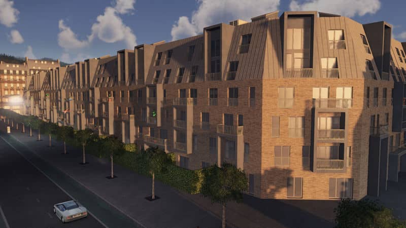 Contemporary brick residential midrise building inspired by a regeneration project in London, United Kingdom. Level 4 high-density residential growables. Footprint: 3×2 and 3×3.