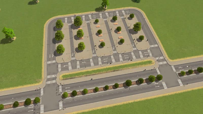 This bus stop (as a park), is very compact, only using 13×6 tiles and offering 12 possible bus stops.