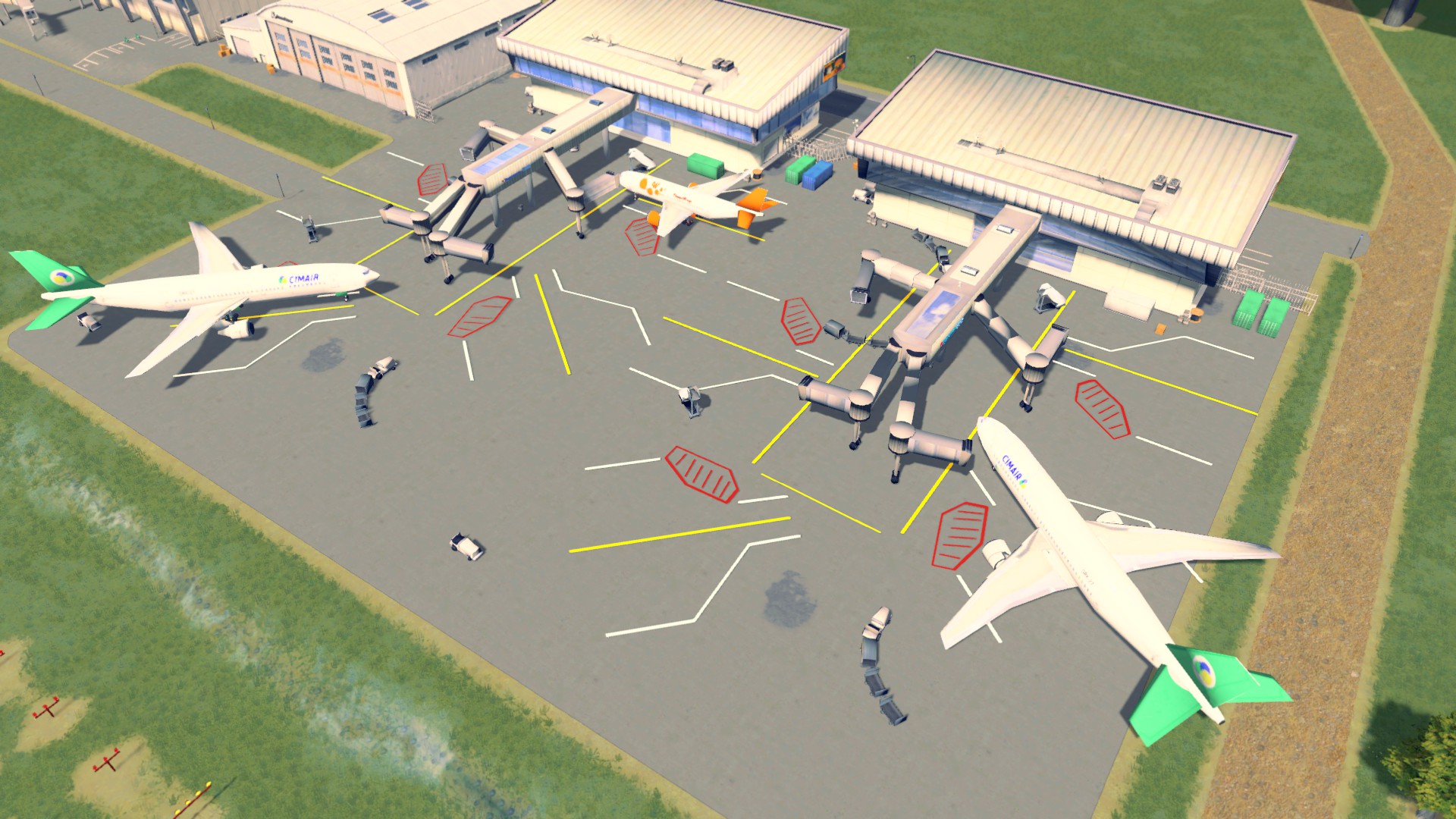 Here comes a quick attempt at making modular airport assets. This consists of a small terminal building with small to medium gates, passengers ramps and parked airplanes. I’ve also included a lot of small details, as custom ads, ground marks and service props to make it more immersive.