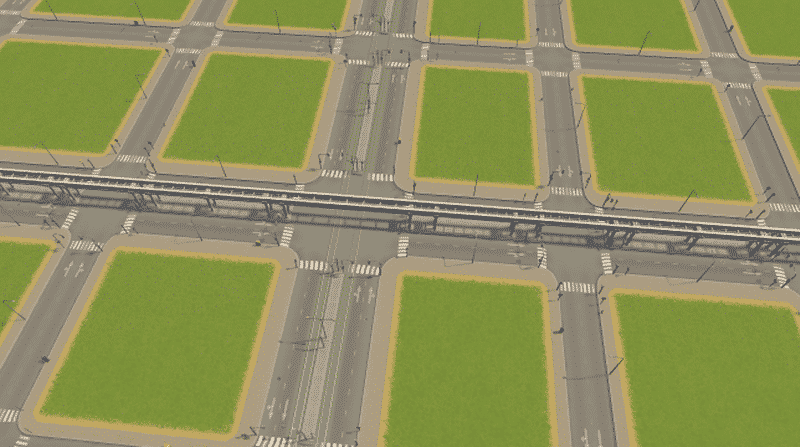 This particular piece features a tramway running north-south, a monorail avenue running east-west, and one way sidestreets in alternating directions. It can be lined up and connected with any of the other grid pieces in this workshop collection.