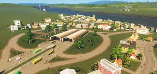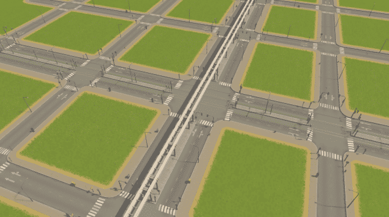 This particular piece features a monorail avenue running north-south, a tramway running east-west, and one way sidestreets in alternating directions. It can be lined up and connected with any of the other grid pieces in this workshop collection.