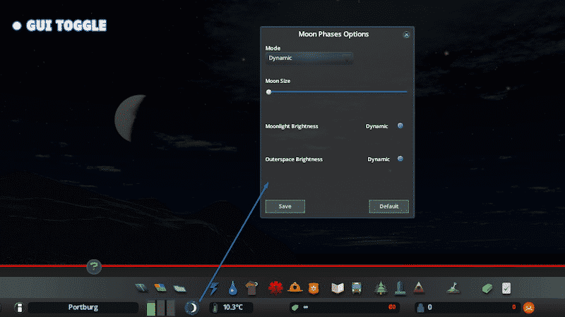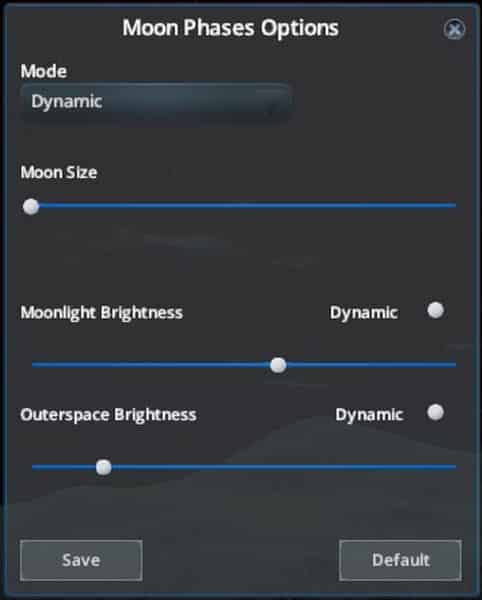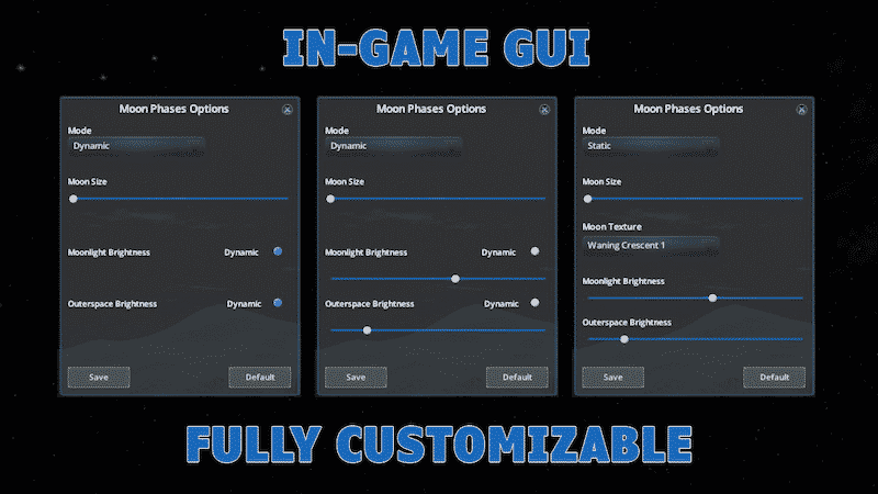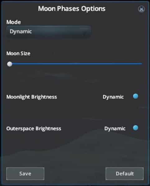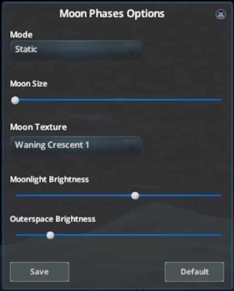 - Option to have dynamically changing moon phase, but static moonlight and outer space/stars brightness.