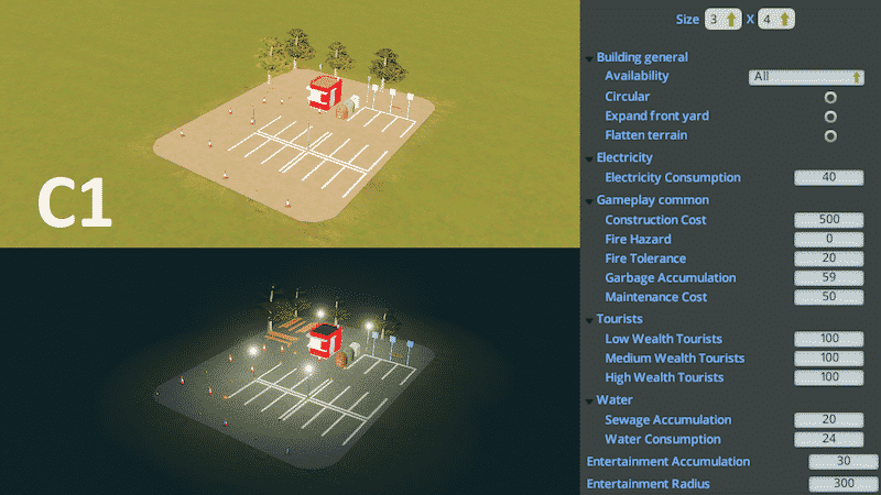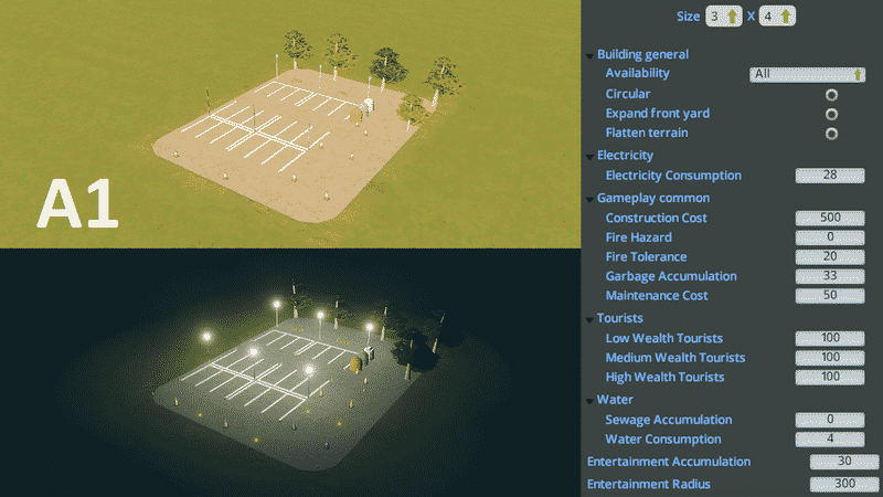 - Now you have to change to the category parks and search a front section of the service area with the name A + number (Example: A1, A2). This one you place in the front area of the one-way lane with trees (the first three boxes).