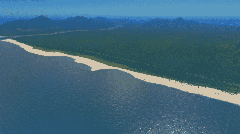 Mountains to the Sea, beautiful white sandy beaches with mountains partially surrounding a nice city build area. Plenty of trees. Most industries available. Shipping on coast and some parts of the river. Crystal blue green waters.