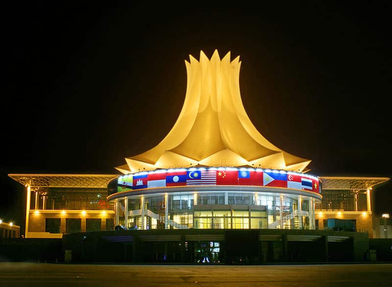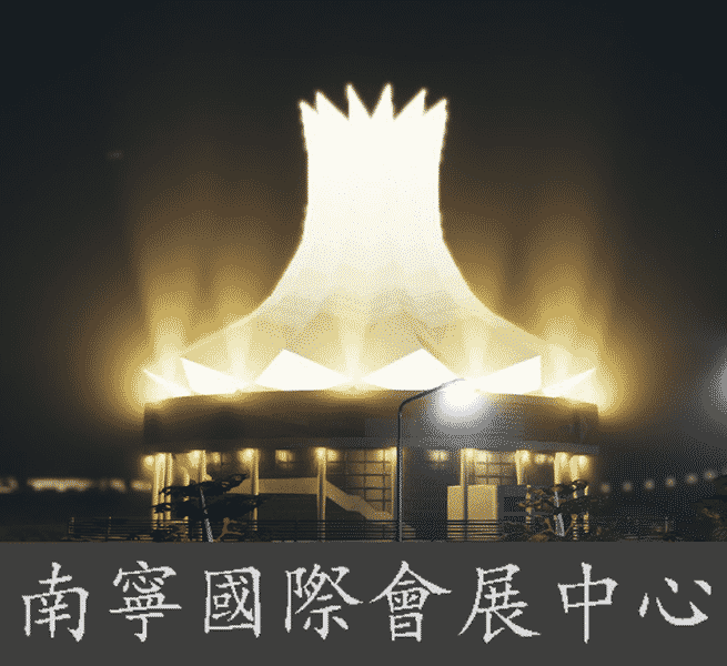 The building complex of Nanning International Exhibition and Convention Center (NICEC) is located outside the city borders on a little hill. It is divided into two parts: the central entrance with the multi-purpose hall and additional facilities for conferences. This building with its great folded cupola, which rises nearly 90 m above ground, is the outstanding landmark representing NICEC. The great cupola is a folding steel structure covered by two layers of membrane material. It has a high translucency so an inner lighting will shine through the skin. Generous exhibition areas are arranged in its back. The exhibitions can take place on two different levels. The lower level is covered by curved concrete structures. The halls of the upper level are covered by folded steel roof structures.