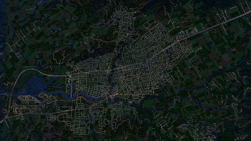 The road networks and other details were laid out using the Image Overlay Mod , using a Google road map (acquired using Simple Mapper) and then a satellite map pieced together from Bing Maps.