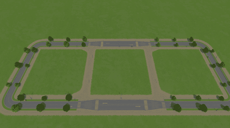 This is my third city grid to date, which includes a slightly different technique used to get crosswalks on the roads where you need them most. This city grid will allow pedestrians to walk to their destination by walking the majority of time (if you give them walkways).