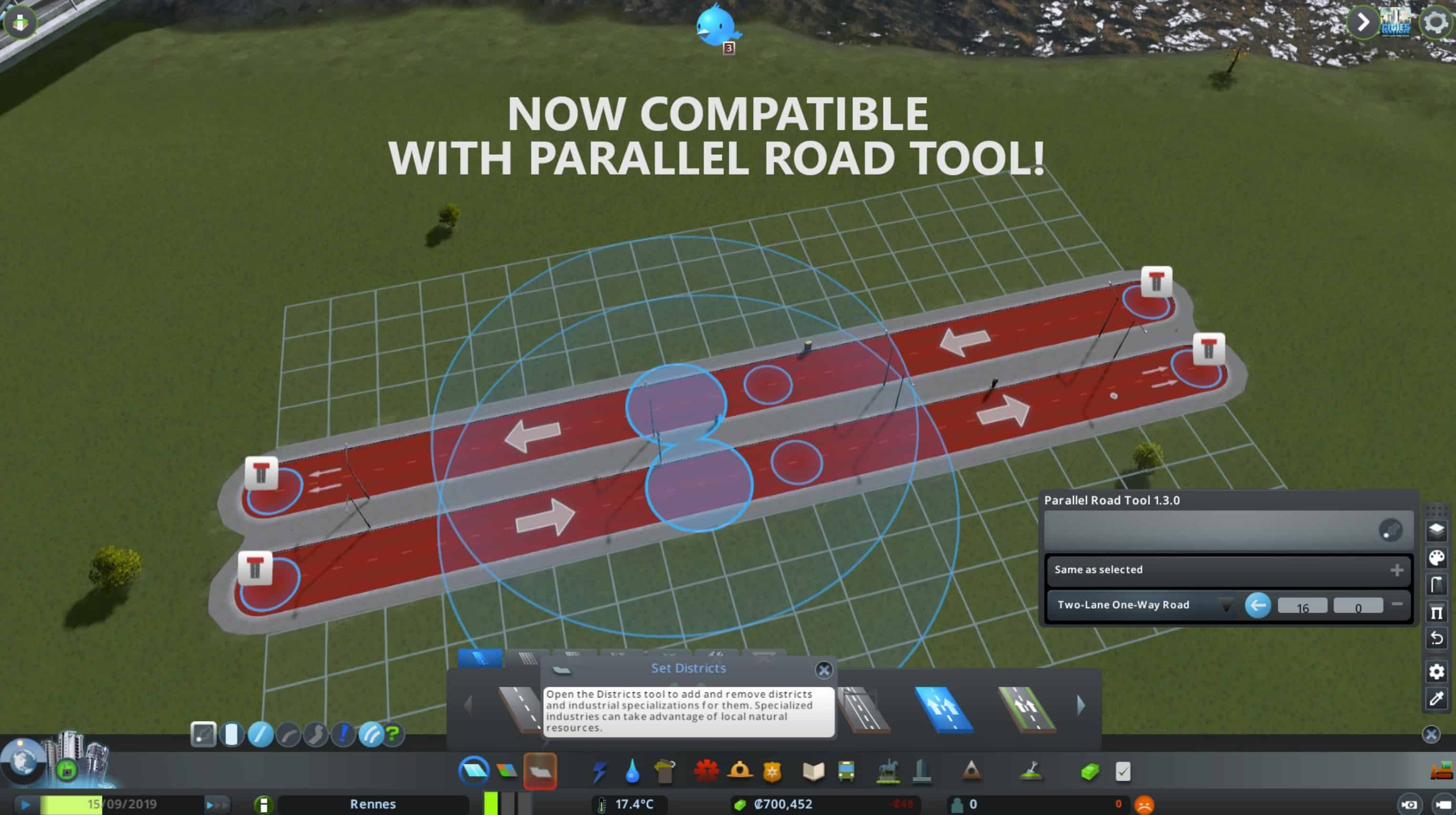 Change street lights and change the repeat distance. Also supports custom street lights! The light color of every street light is shown in the selection list.