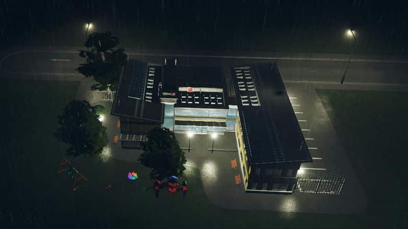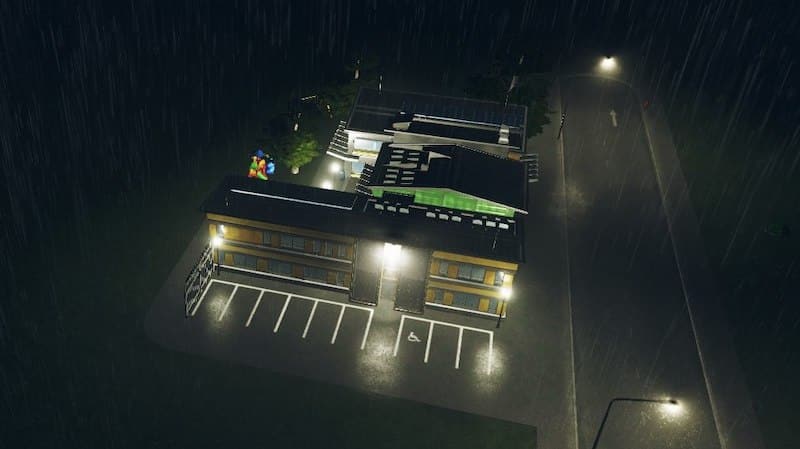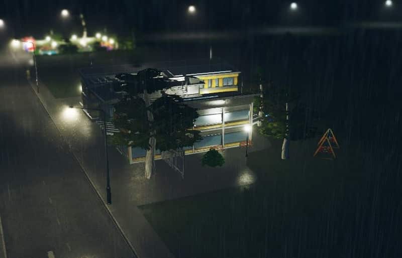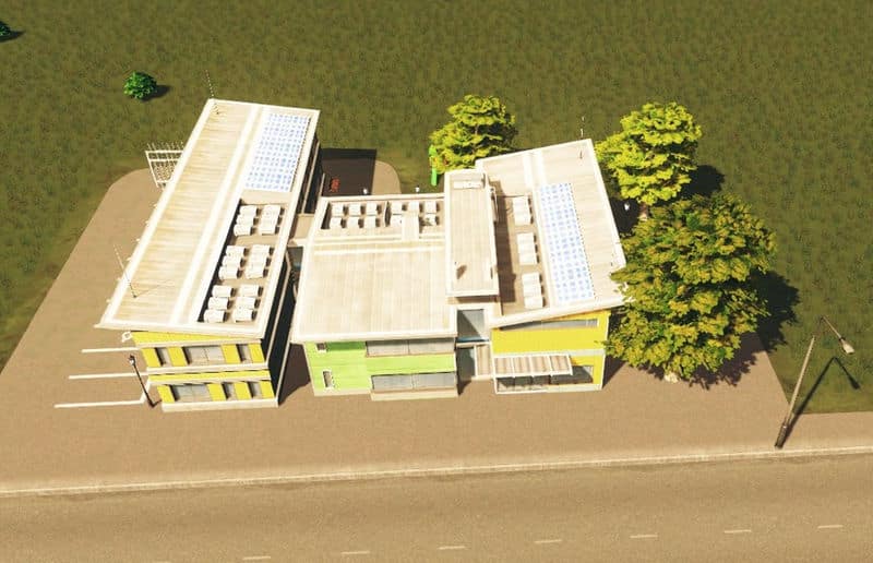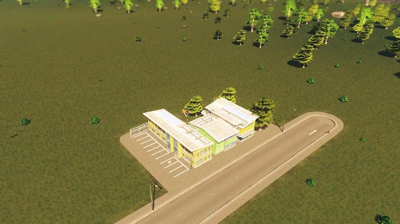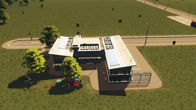 A new improved elementary school with larger capacity and ultra larger radius. It accepts 1000 students and can cover an entire city land. I added few trees.