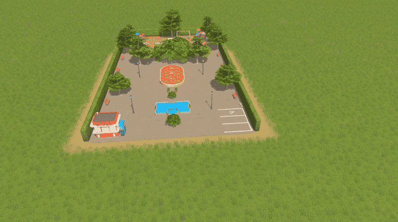 It is composed of different trees, bin, decorations, flowers, playground stuff, barriers, a grill shop, parking, bicycle parking, lights, and so on. It is also larger in size.