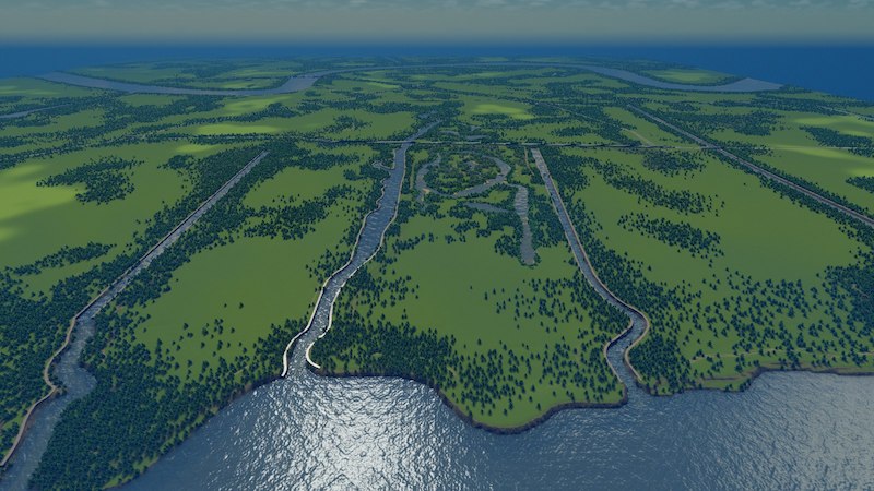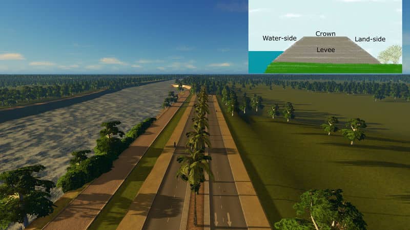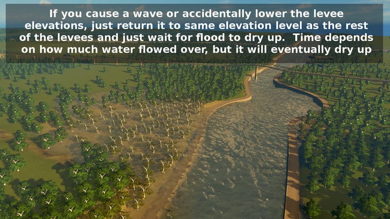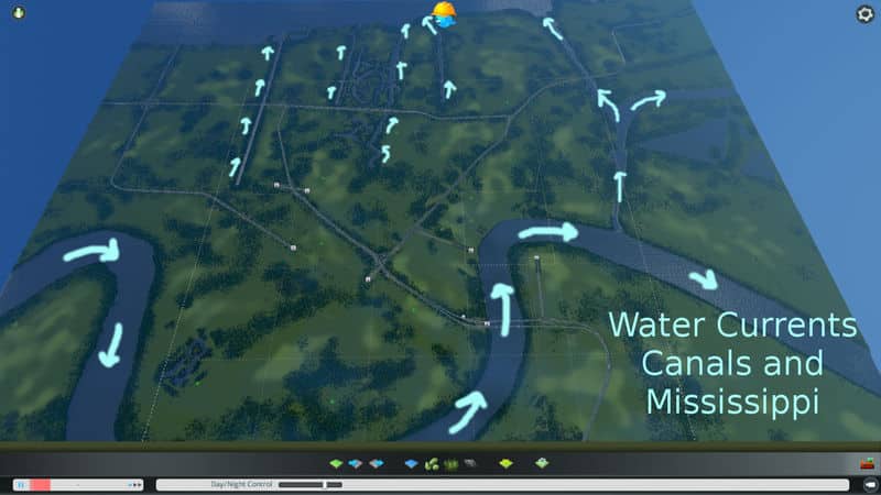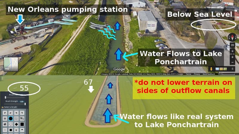 – Simulated New Orleans Industrial Canal, and outflow canals with correct water flow direction from real life pumping stations. There are water spawns inside the outflow canals so you can place pumping stations (or sewage stations) and have the water continue to flow. Break the levee and the water spawn will just keep producing water until the entire city area you’ve exposed to flood waters has filled up. If you fix the levee the water level will slowly reduce until you have dry land again.