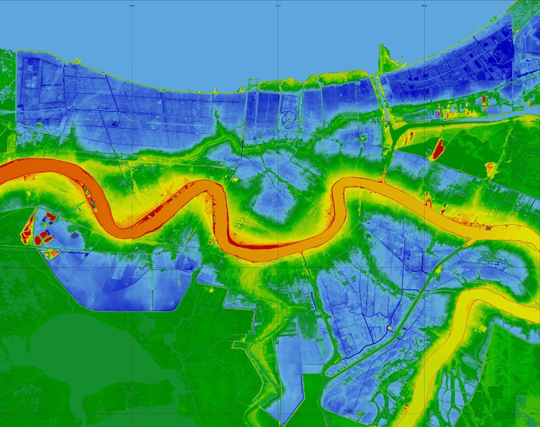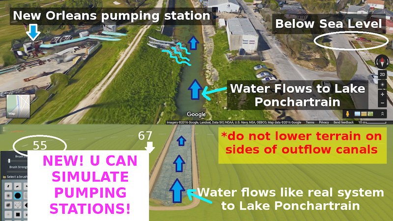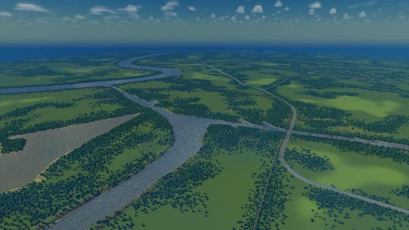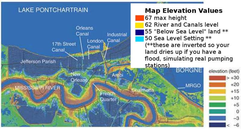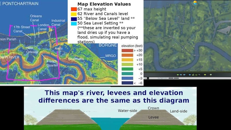 It has true to life land elevations and river / sea level. This means that much of your land is below sea level. If you have a hurricane or storm surge, you’re going to have to invest in the services buildings (water management and emergency services) that handle this issue.