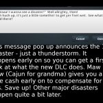 There is one early, small disaster just because I know a lot of you will want to see what happens ? This serves as a test to make sure the disasters were input right. If you aren’t getting disasters for a long time (years) after that, it means that you haven’t fulfilled some of the parameters for a disaster to occur, so just keep saving up because when the big one does hit, it’s a whopper!