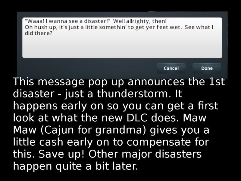 **Every disaster for this scenario has a story message, so if you’re getting disasters without story (and you’ll probably be getting way too many disasters by the way), then you probably have random disasters turned on. Please turn off the random disasters on Options Menu, Gameplay. You’ll be getting plenty with the ones already designed into the scenario, but they’re spaced out timewise.