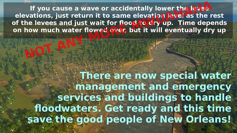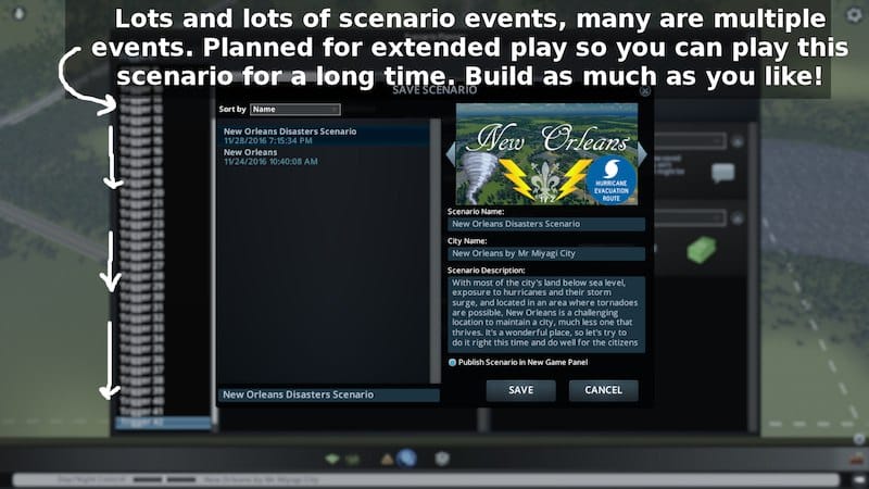 New Orleans Disaster DLC Scenario With most of the city’s land below sea level, exposure to hurricanes and their storm surge, and located in an area where tornadoes are possible, New Orleans is a challenging location to maintain a city, much less one that thrives. It’s a wonderful place, so let’s try to do it right this time and do well for the citizens of The Big Easy!