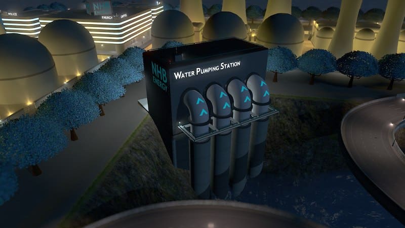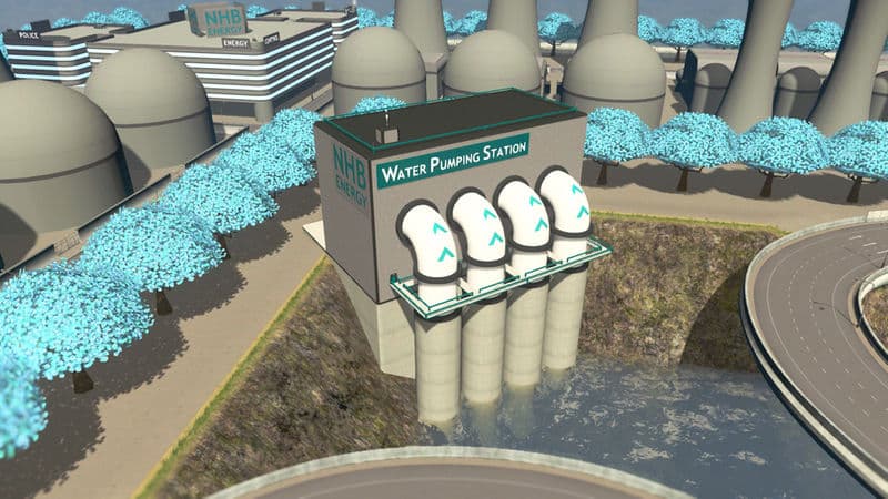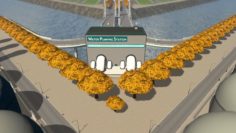 Economic, quiet, high volume water pumping station. This station costs twice that of the in-game asset, but pumps four times the water, emits less noise pollution, and requires less maintenance for the volume it pumps.