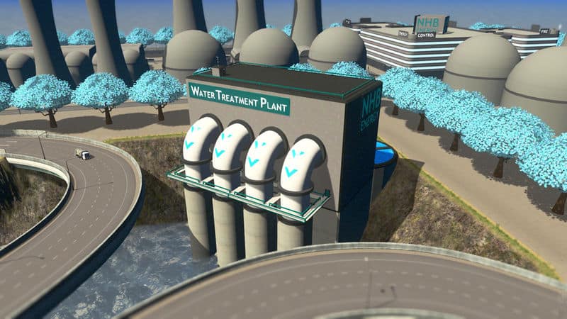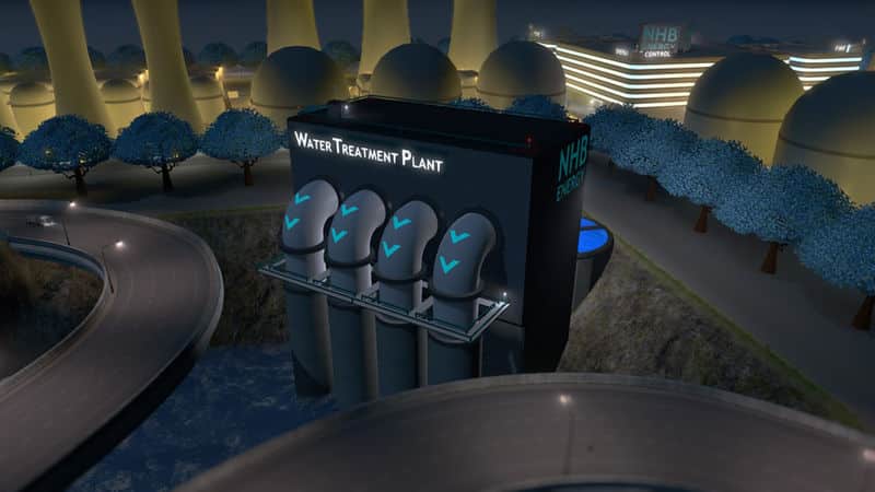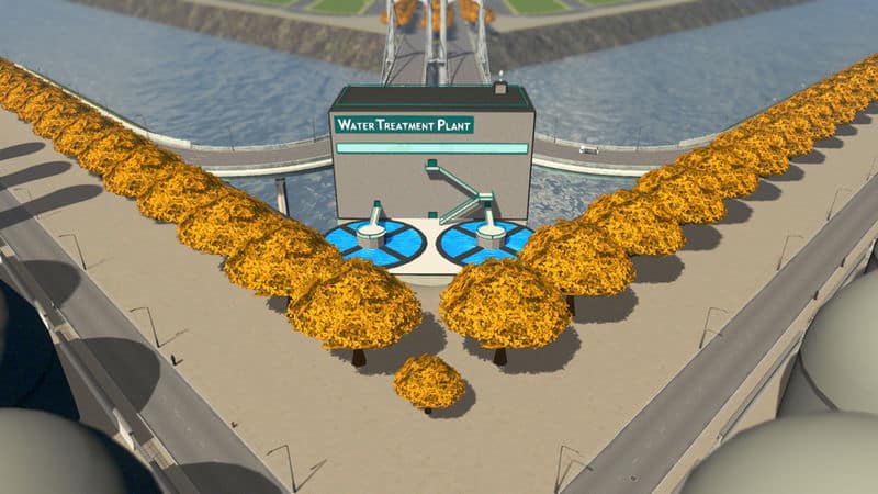 Economic, quiet, high volume water treatment plant. This plant costs twice that of the in-game asset, but processes four times the sewage, emits less noise pollution, and requires less maintenance for the volume it processes.