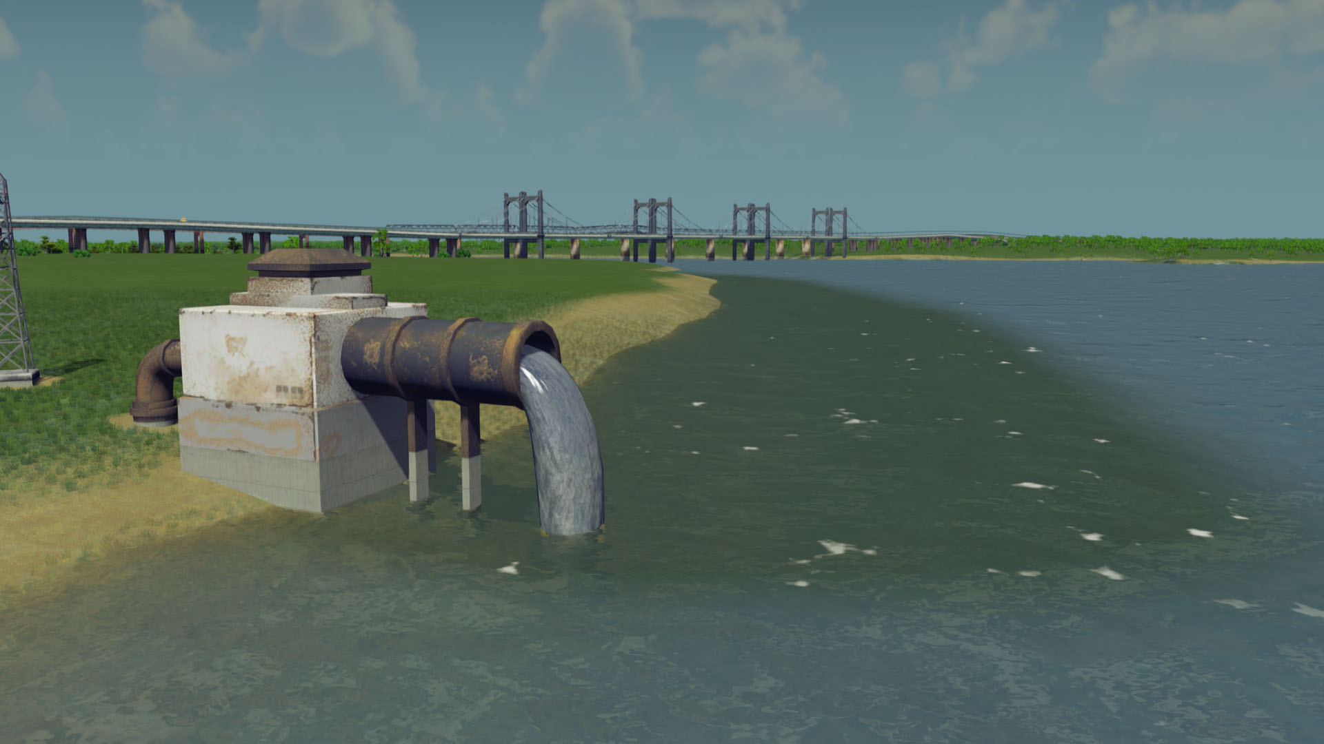 This mod changes the color of the water pollution to a faded green, replacing the purple color.