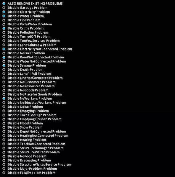For example, you can disable No Road Access problem. Or Not enough workers. Etc. You get the gist.