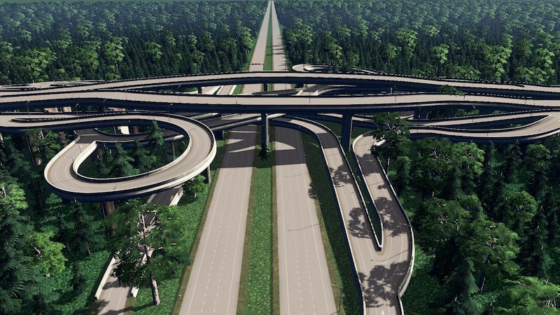 A complex-looking four-way stack interchange with one of the highways elevated. Some of the ramps are quite tight, so this junction may not be the favourite among the truckers who have to keep their vehicles under control on this interchange ?