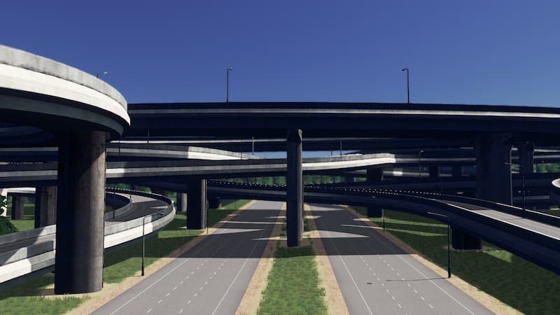 A complex-looking four-way stack interchange with one of the highways elevated. Some of the ramps are quite tight, so this junction may not be the favourite among the truckers who have to keep their vehicles under control on this interchange ?