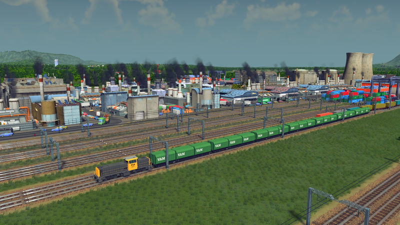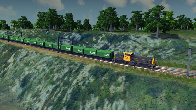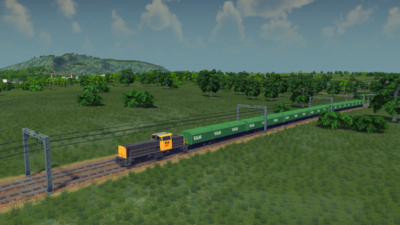 A cargo train consisting of ACTS container cars loaded with garbage containers. Engine is a NS 6400 series diesel electric engine. The containers are in the livery of the VAM (Vuil Afvoer Maatschappij).