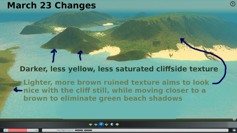 – Ruined texture changed significantly. This means there is no longer green on the sand when items are placed down. Unfortunately this is also the same color that appears between cliffside and grass, so we have to find a happy medium between sand color and green verdant mountain of the Cliff texture. Work in progress, let me know how you feel about it