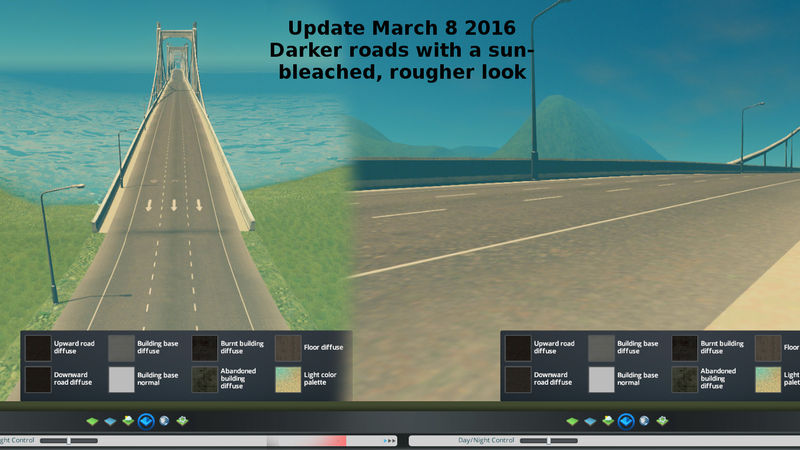 – Darker road textures with weathered (sun bleached) look. Hopefully it looks the same in-game. See picture above for how it looks. Mild change was the goal