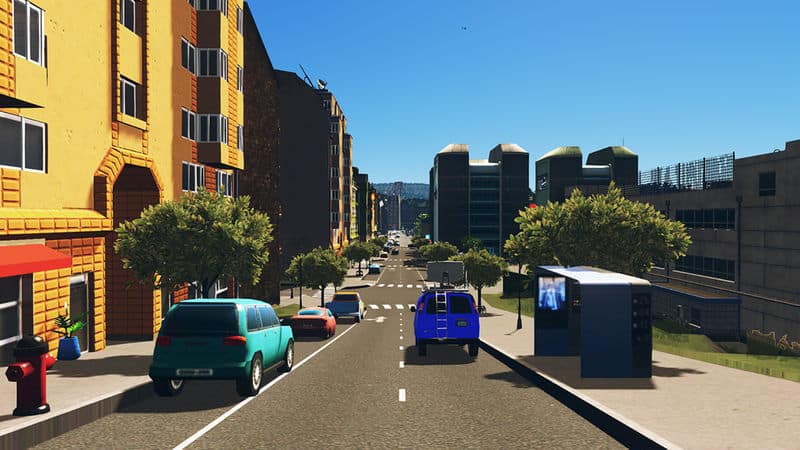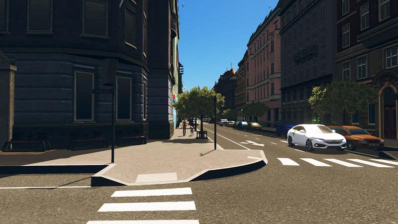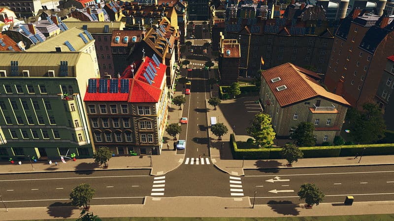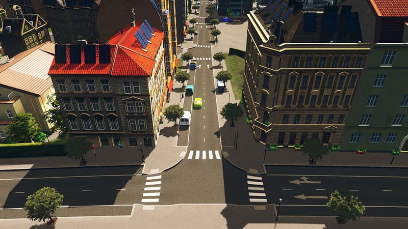 - 16m (2 tiles) wide right-of-way – two 3m one-way vehicle lanes, with 2m parking lanes and 3m pavement (5m at bus stops) on both sides